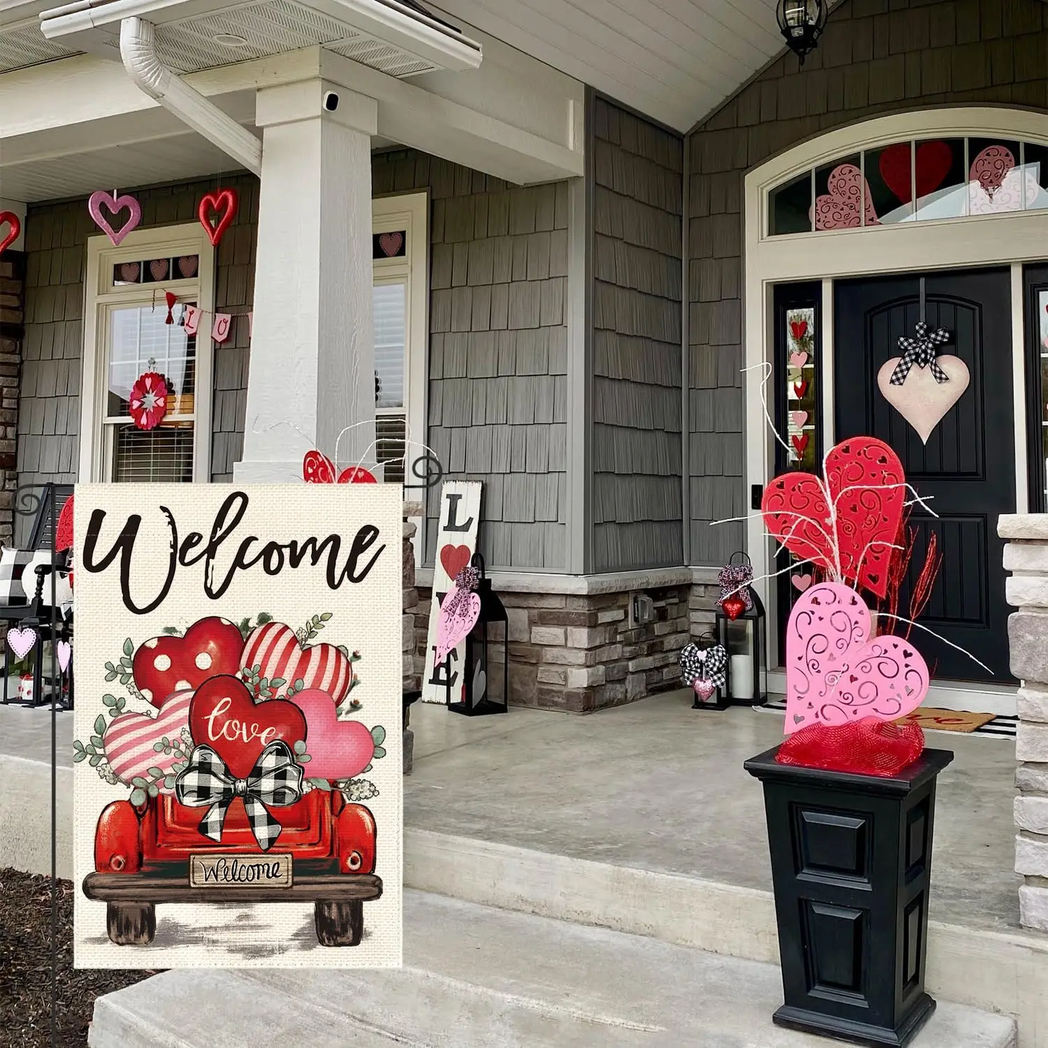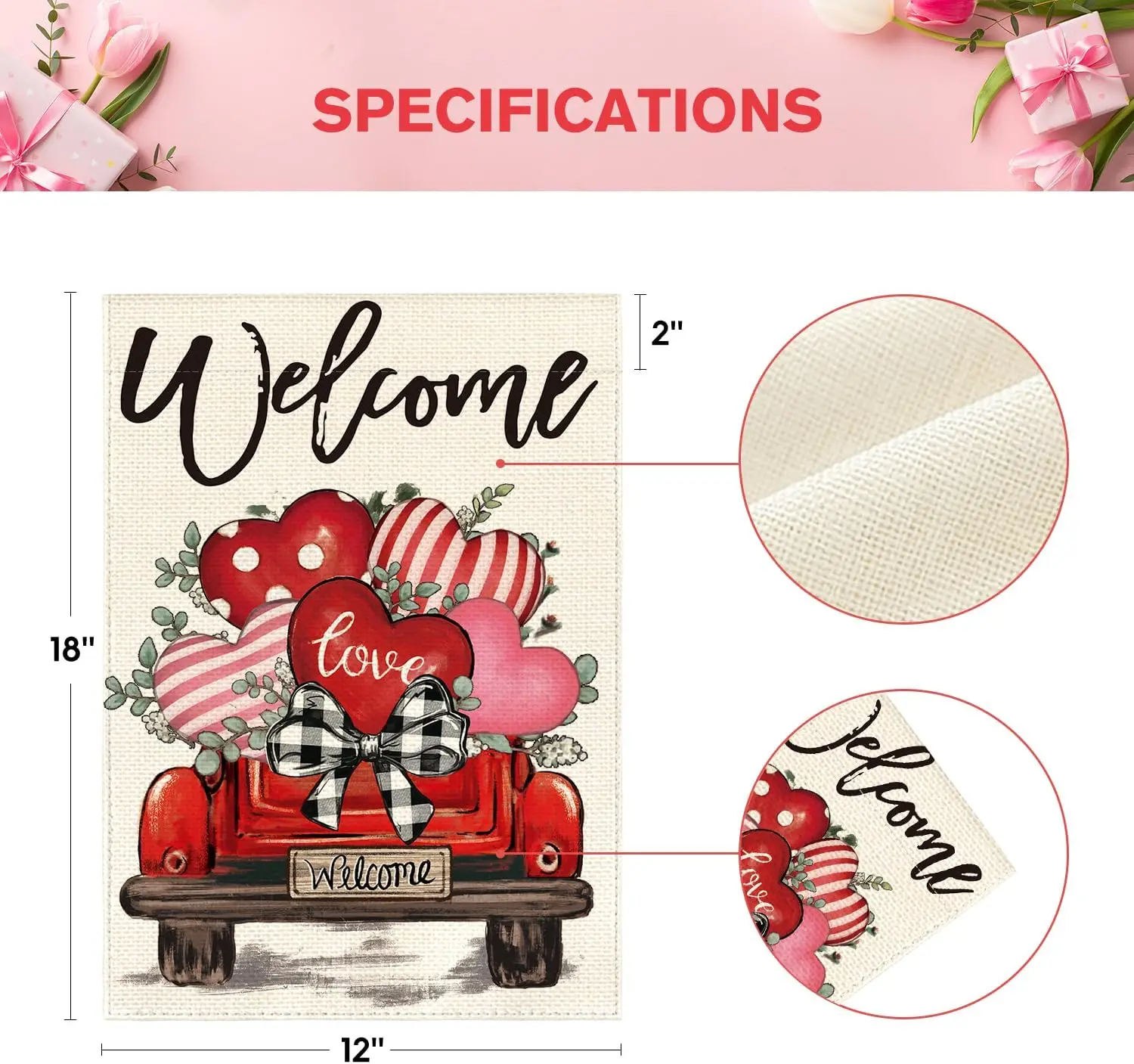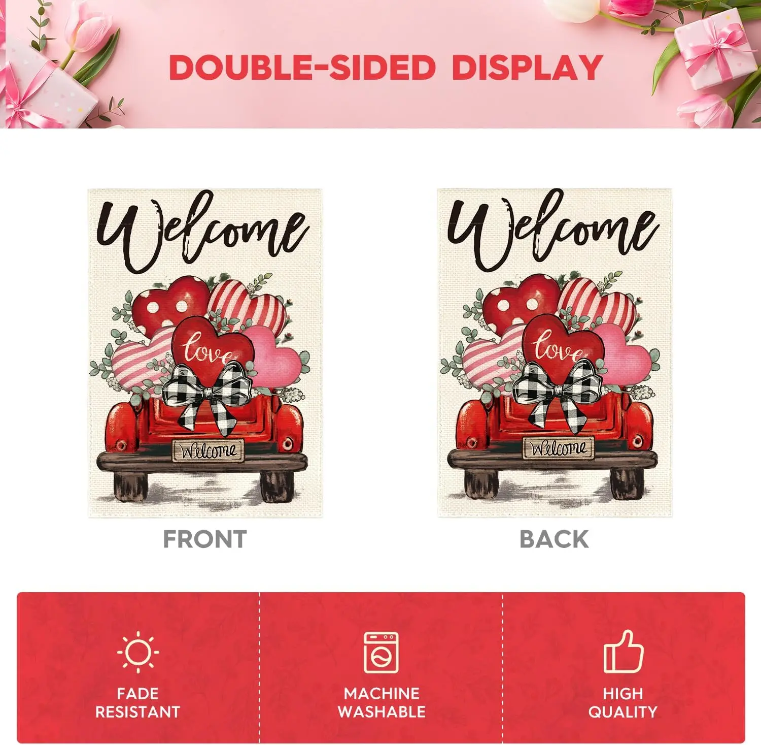 Spread love this Valentine’s Day! This double-sided garden flag features a rustic “Love Hearts” truck design, adding festive charm to your yard, garden, or patio. Made from durable, weather-resistant fabric, it’s perfect for outdoor décor and easy to hang on any standard garden flagpole.